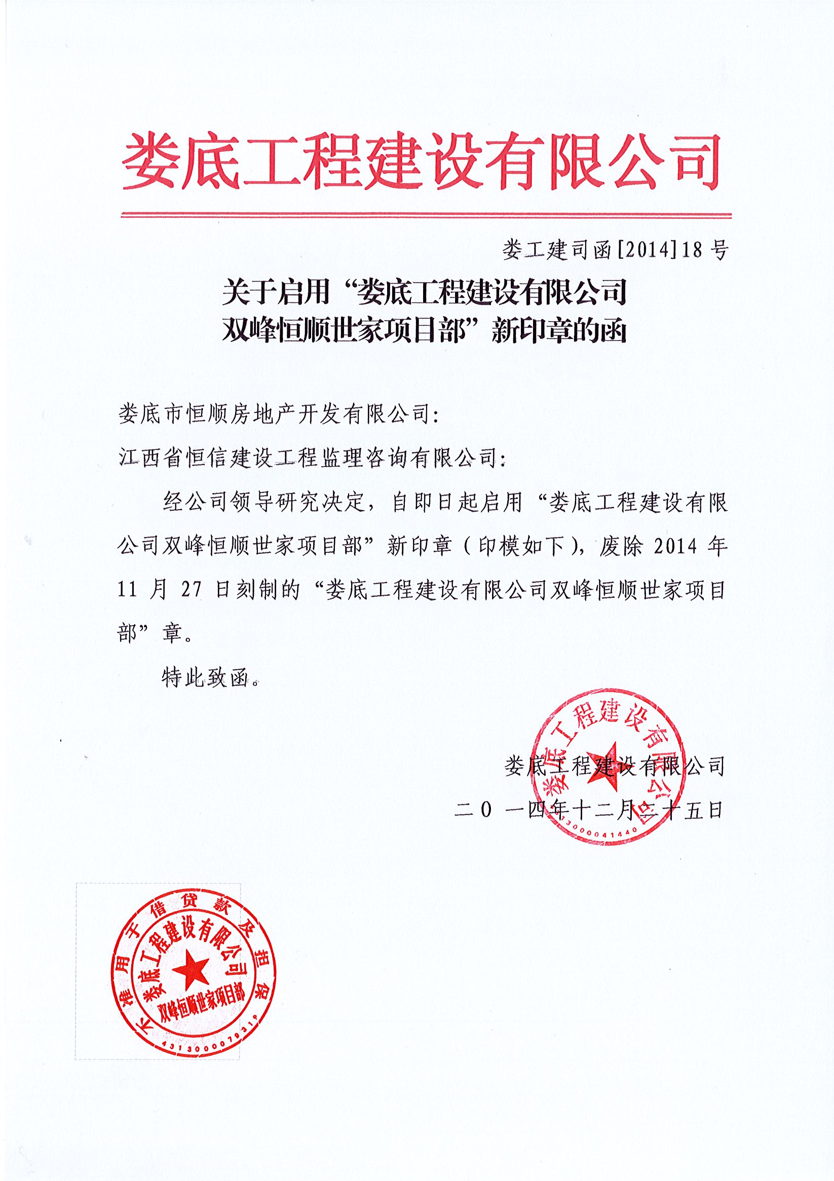 關(guān)于雙峰恒順世家項(xiàng)目啟用新印章的通告