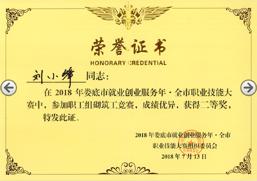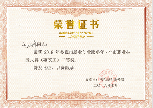 2018年7月13日,由婁底市人力資源和社會保障局、婁底市總工會、婁底市住房和城鄉(xiāng)建設局主辦的“2018年婁底市就業(yè)創(chuàng)業(yè)服務年.全市職業(yè)技能大賽”圓滿落幕。我公司選送的參賽選手劉小峰獲職工組砌筑工競賽二等獎,并被授予“婁底工匠”。