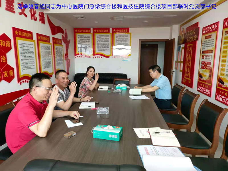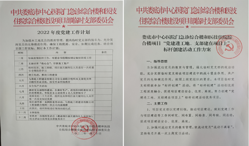 該項目地處婁底市最繁華街道的十字路口,又是婁底市最大的單體建筑公共項目。項目中標后,公司立即配備優(yōu)秀骨干組建項目部班子,并成立了中共婁底市中心醫(yī)院門急診綜合樓和醫(yī)技住院綜合樓建設項目部臨時支部委員會,推舉項目經理姚春旭擔任臨時黨支部書記,并安排了黨建指導員。該支部目前有黨員8人。項目部設置了黨員活動室,文化走廊等,臨時黨支部“五化”建設達標。